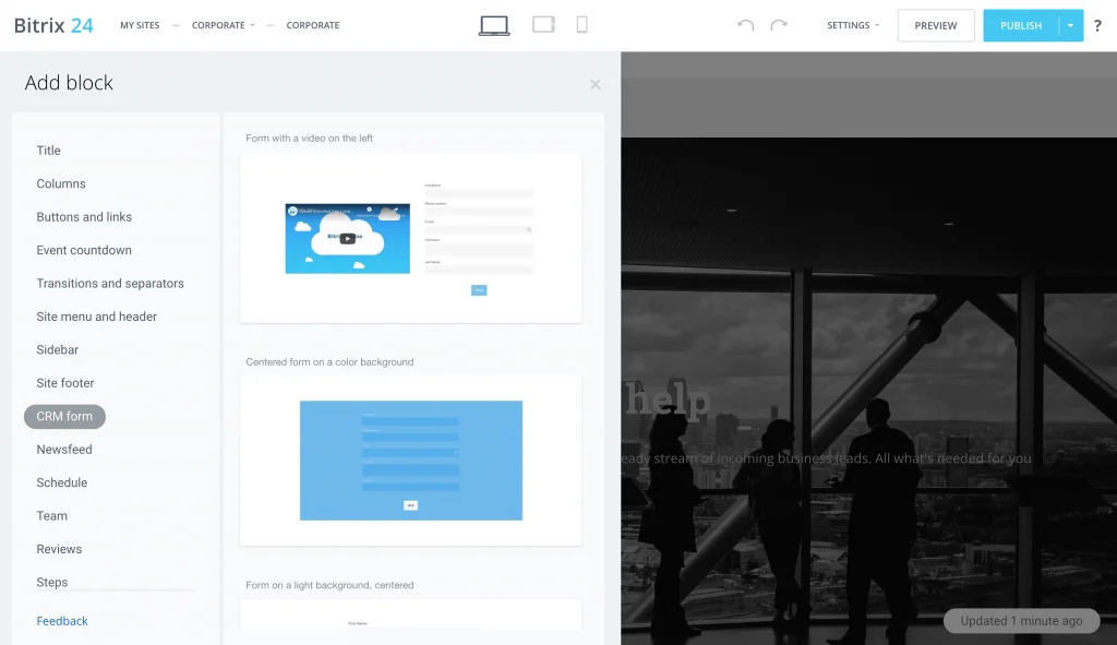 Users can place any type of CRM form (callback form, feedback form, appointment form, etc.) created in Bitrix24 on any website, whether it is created in Bitrix24 or any other CMS. For sites created with Bitrix24, the form can be placed as a block on the page. For sites created in another CMS, the form can be placed as a block on the page, in the window that opens after the page loads or in the window that opens after a button click.