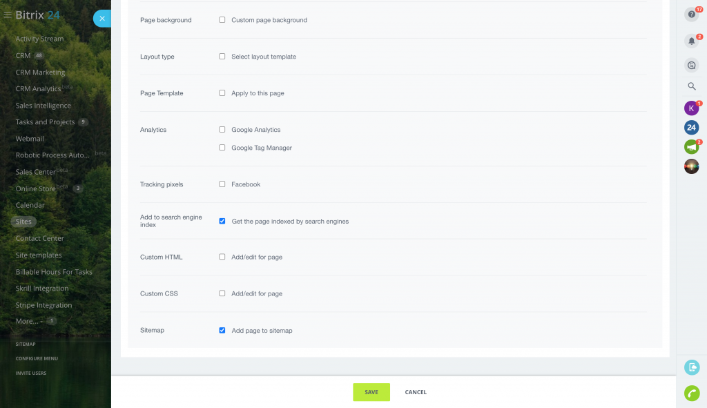 In Bitrix24.Sites you can add any page to Sitemap. The Sitemap in the sitemap.xml file is created automatically. You just need to select a website you want to generate the sitemap.xml file for and add pages to sitemap.