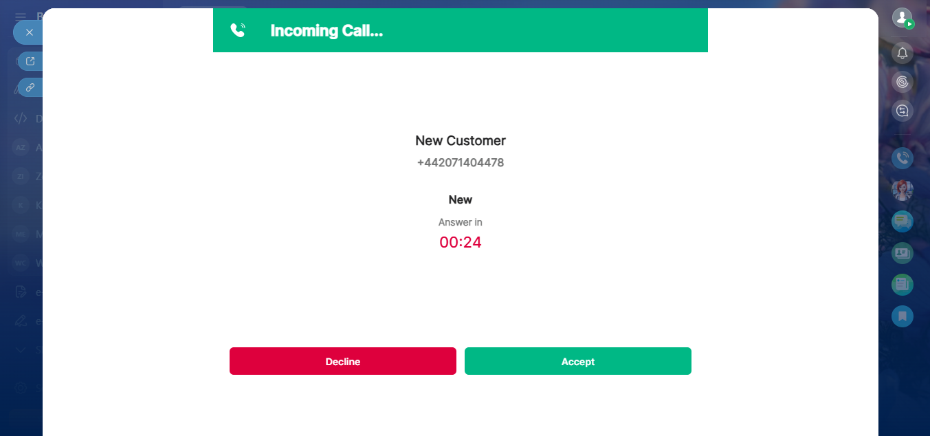 Users can receive and manage incoming live chats initiated by customers directly inside the Bitrix24 CRM using the Worktual Contact Centre. Once a chat request is received, the user must accept it to start a real-time conversation.