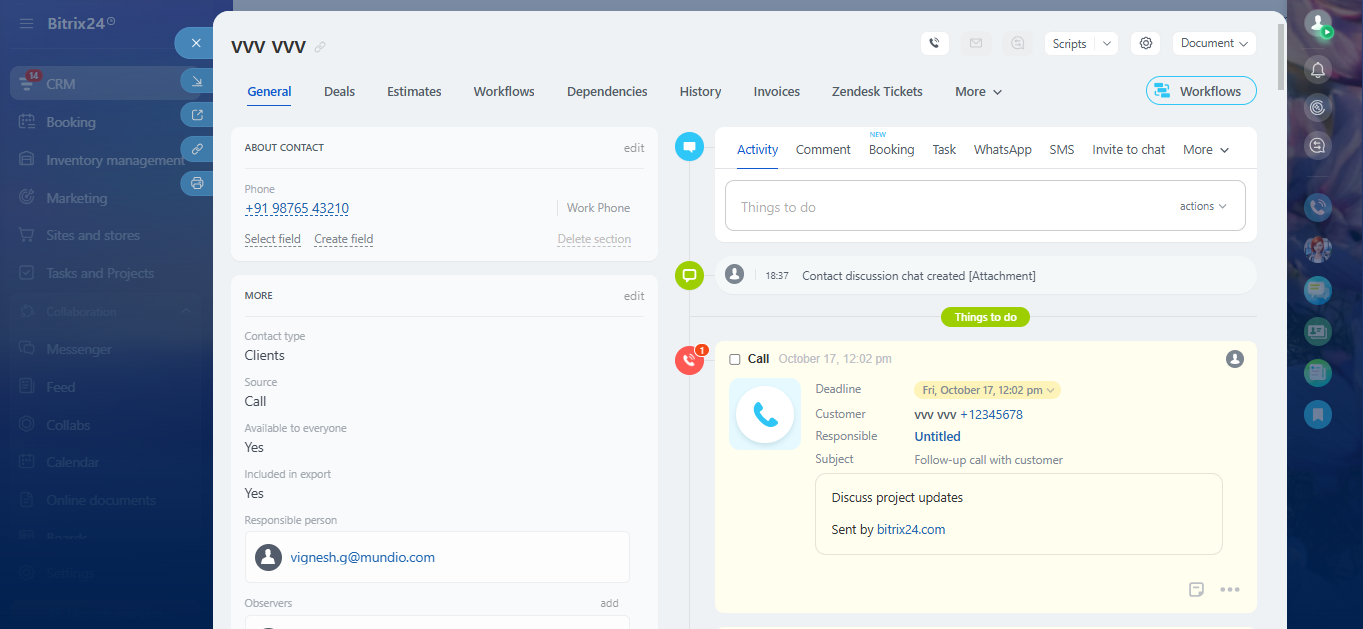 - If the customer is new, a new contact record is automatically created in Bitrix24 along with the relevant activity.