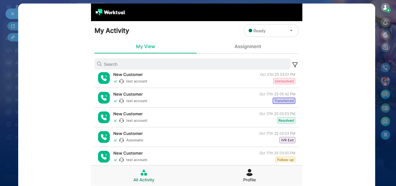 Customer conversations from any channel can be transferred among Agents, Supervisors, or Admins. If a user is unavailable to answer calls or chats, those interactions are automatically stored under My Activity, and can later be handled by the same user or reassigned to another team member who is better suited to resolve the query.