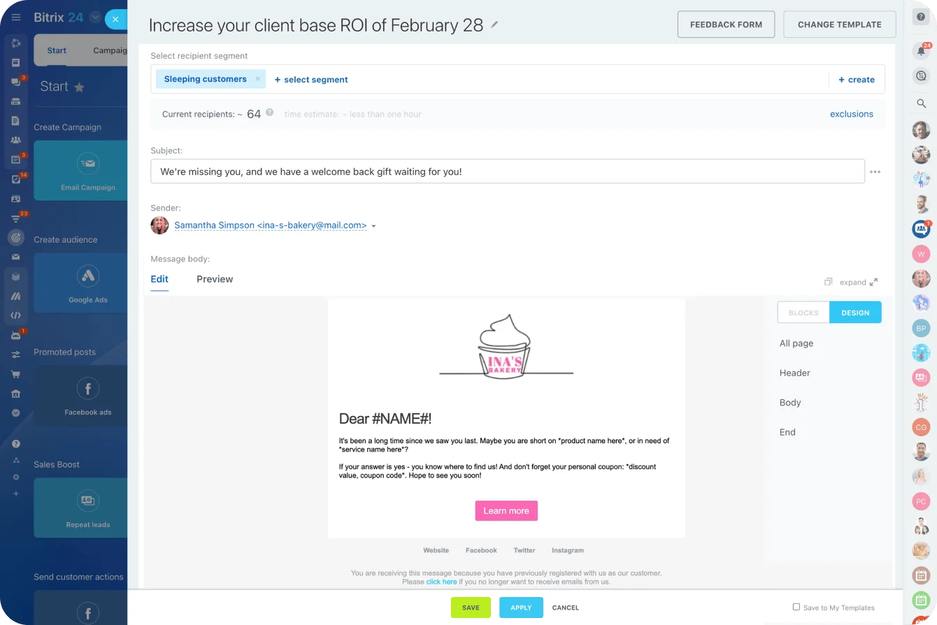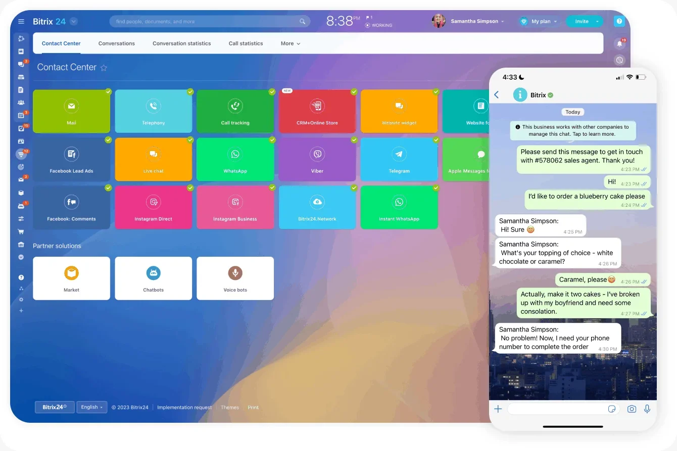 In Bitrix24, trigger upsell campaigns when customers enter specific segments, use auto-funnels to deliver offers based on behavior, and send personalized messages through email, chat, or SMS. Monitor performance with built-in analytics. Because everything is centralized, offers stay consistent and relevant.