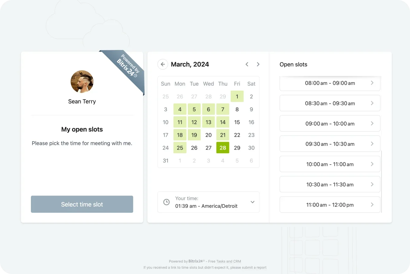 Prospects see the rep’s live availability based on working hours, existing meetings, and defined availability rules inside Bitrix24. Only genuinely open slots are shown, which removes uncertainty, reduces back-and-forth, and speeds up booking.