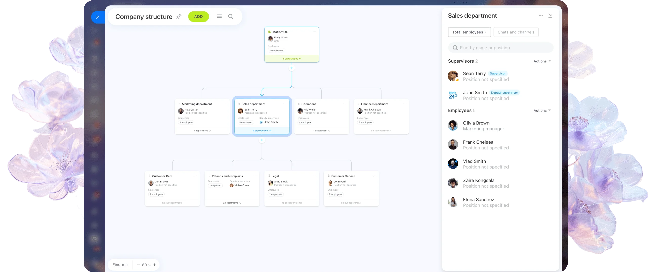View and edit your company's layout in a single, interactive chart. Drag-and-drop employees, departments, or roles to reflect your actual team structure instantly.
