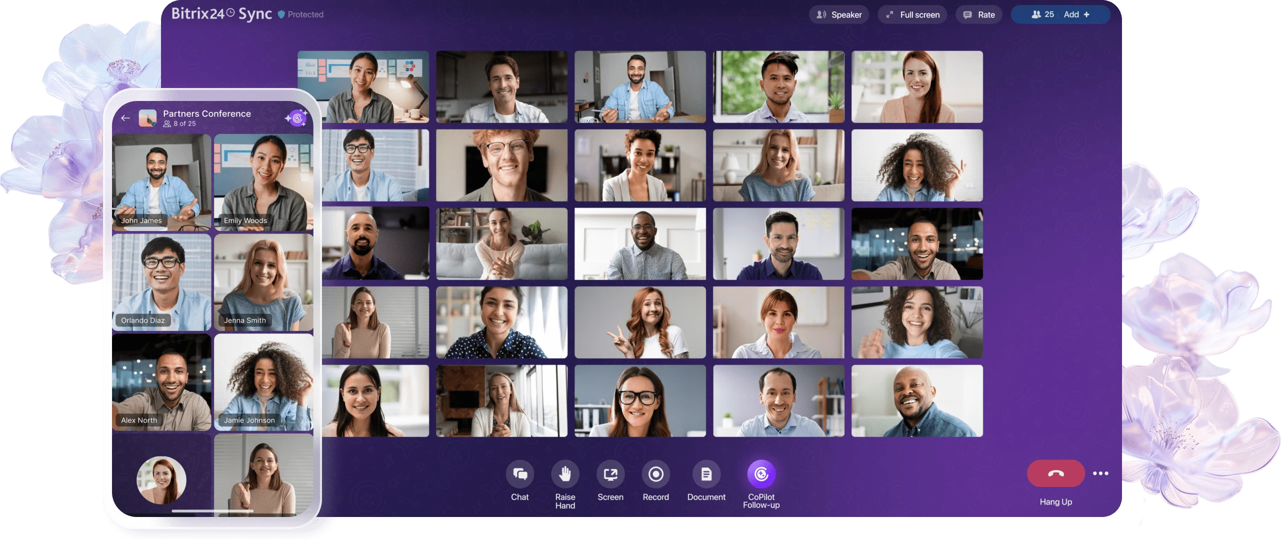 Start a call instantly from a chat, task, deal, or calendar event. Mute, unmute, or spotlight individuals during a call – even in large online meetings with hundreds of attendees.