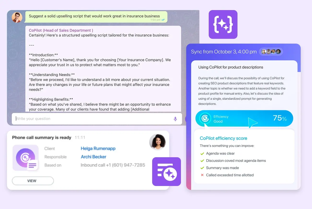 Our AI-powered assistant CoPilot can transcribe calls and use that info to autocomplete fields in CRM deals. Plus, you can pick one of our sales scripts (or upload your own) and let CoPilot analyze your phone calls to see how well your sales reps were following the script.