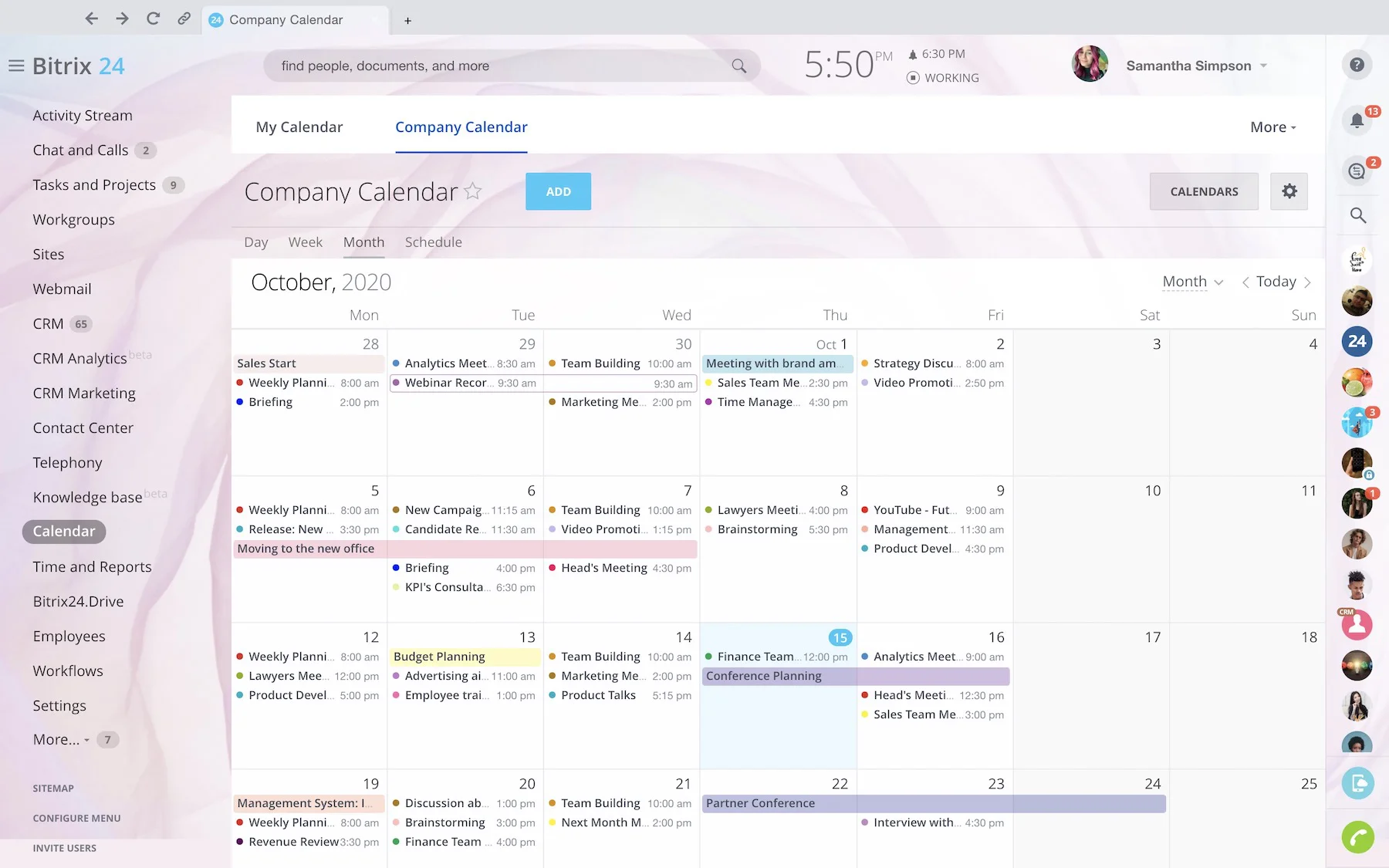 Plan your day, organize work, schedule meetings with your colleagues and external users, manage daily, weekly, and monthly activities – all of this is easily done with Bitrix24.