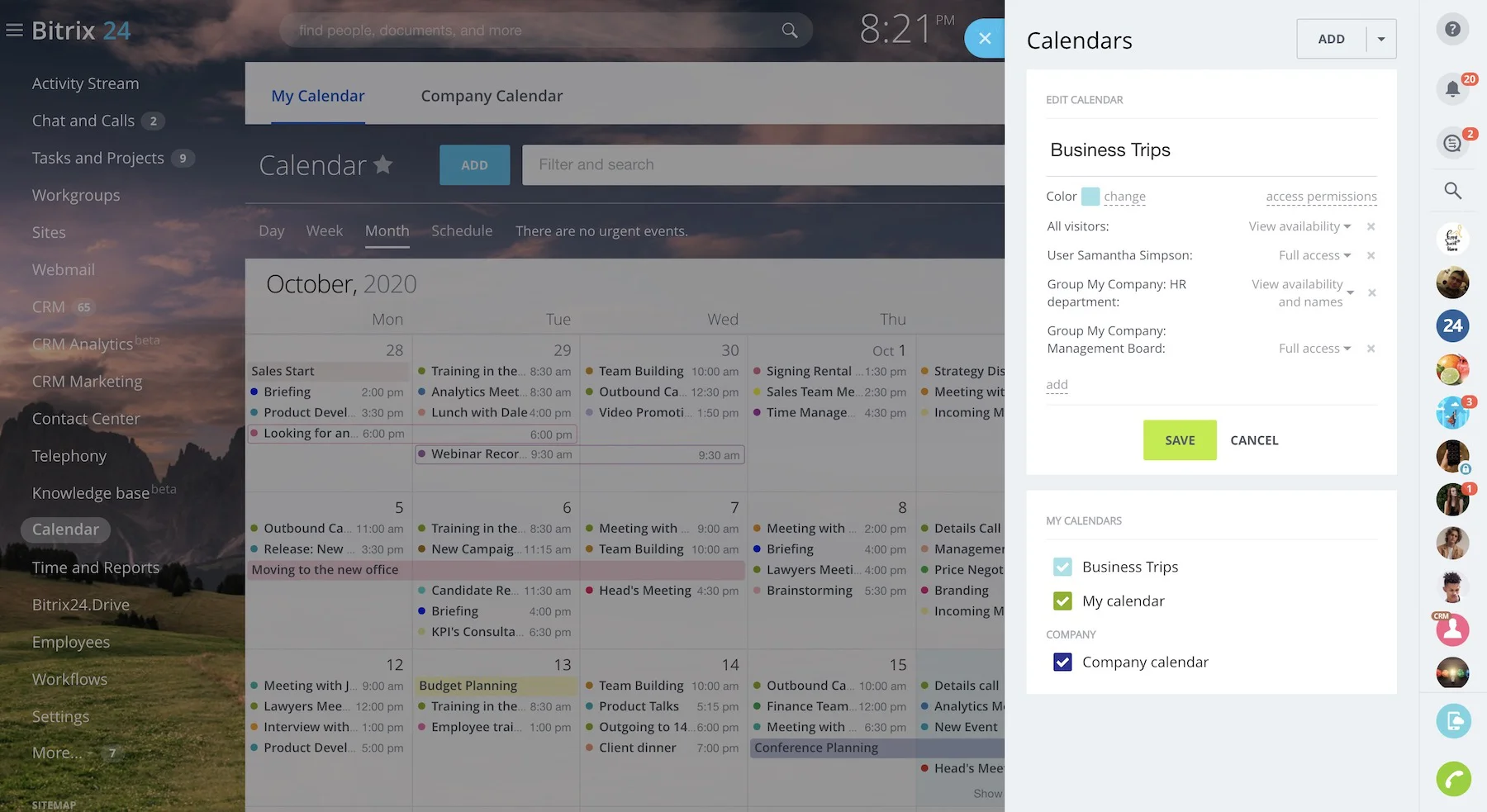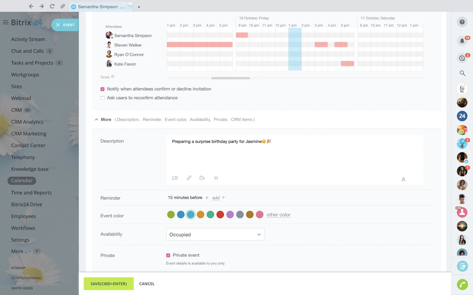 Any event you create in Bitrix24 Calendar can be set as public or private. Public events are visible to everyone, while private events can be seen only by their participants.