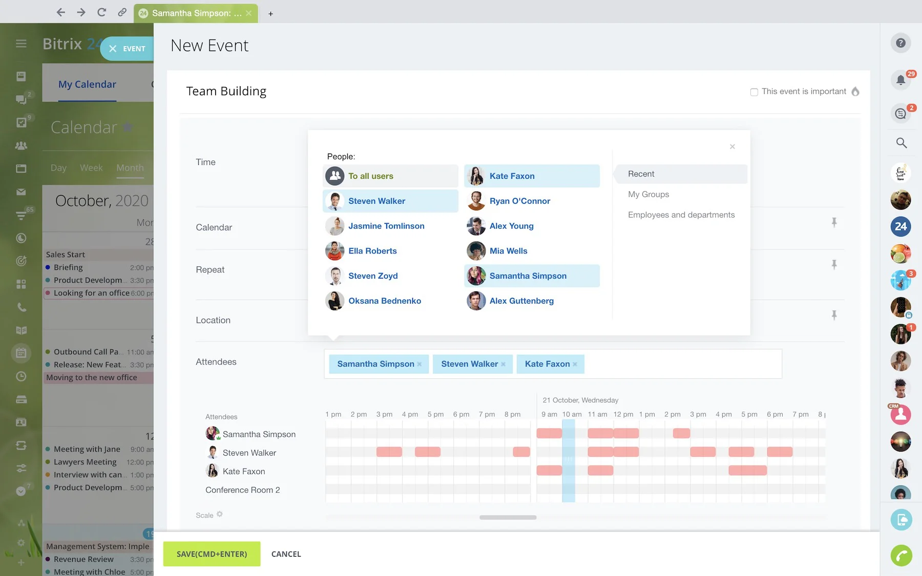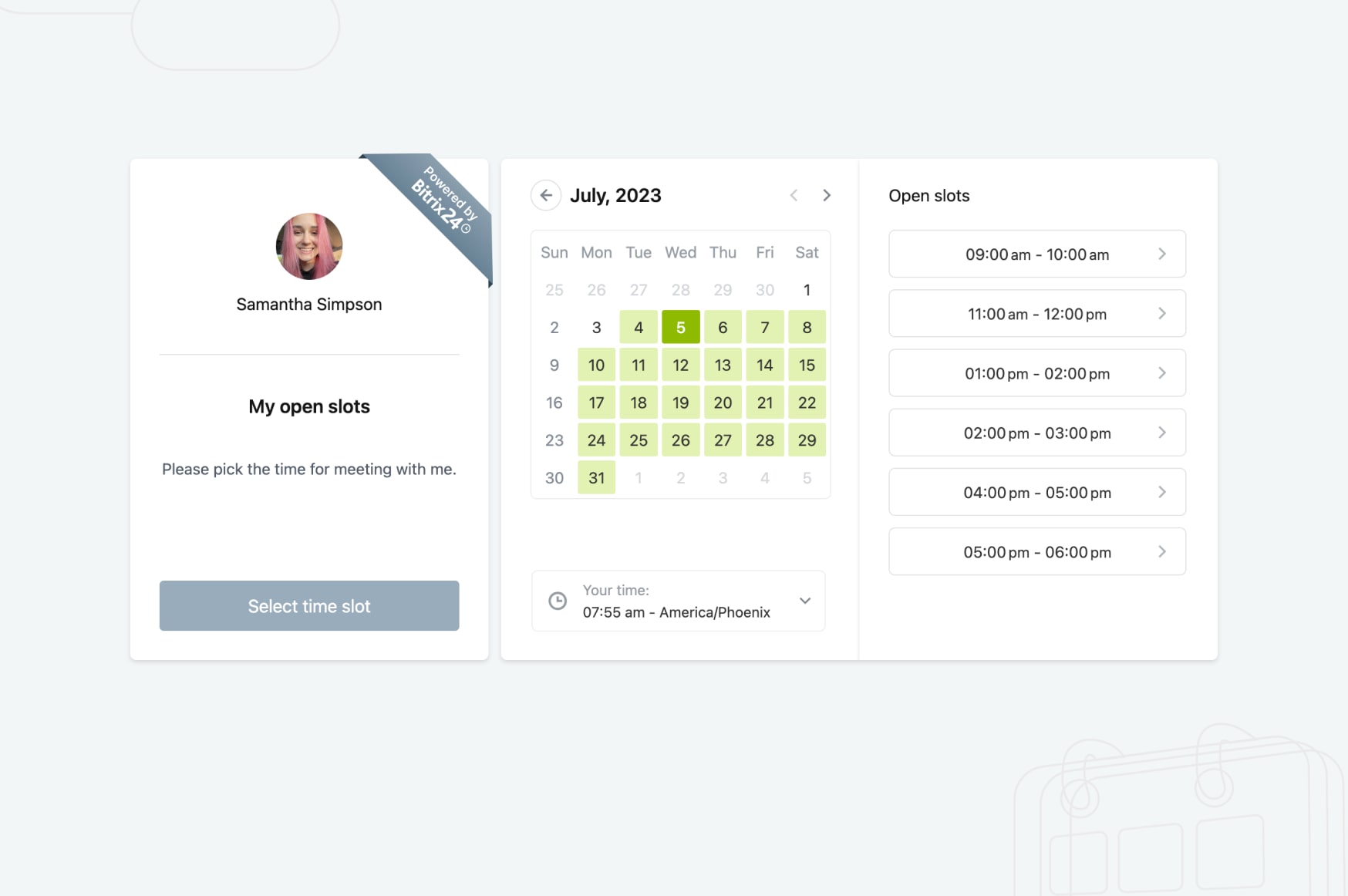 Open slots in Bitrix24 eliminate the need for an endless back-and-forth messaging ("Can you make it 9:00 am? No? How about 10 am?") and allows you to set up group meetings easily.