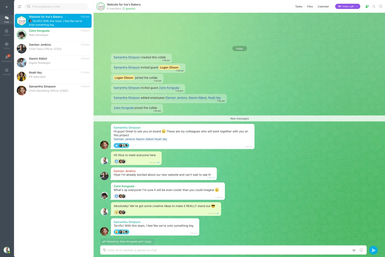 Collab is a simple and convenient way for you to collaborate with external users (freelancers, contractors, clients, etc.). All the project-related chats, video calls, files, and tasks stay inside your account, which allows for easier control and tighter security.