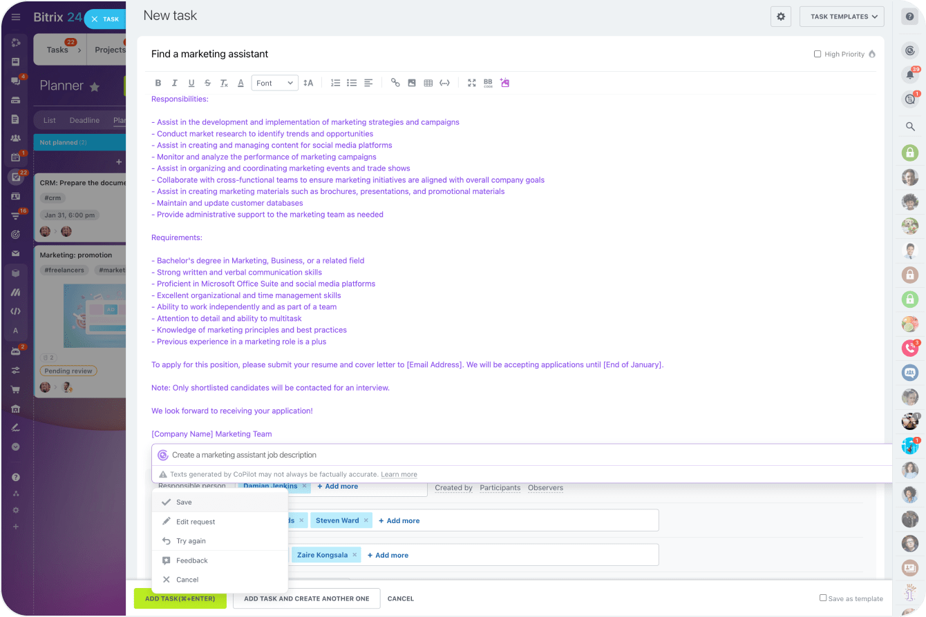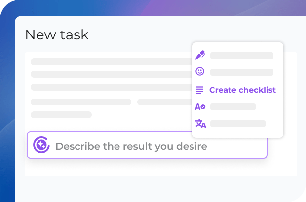 With CoPilot, you don't even have to finish the sentence – just write a brief outline and our AI will fill in the details, adding an optional checklist. That's how AI tasks work!