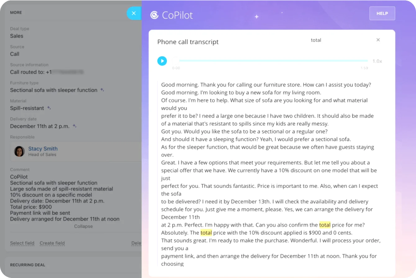 Can't be bothered to fill in the fields in your CRM manually? Not only can CoPilot transcribe your calls, but it can also automatically fill in the right fields (name, phone, company, etc.).