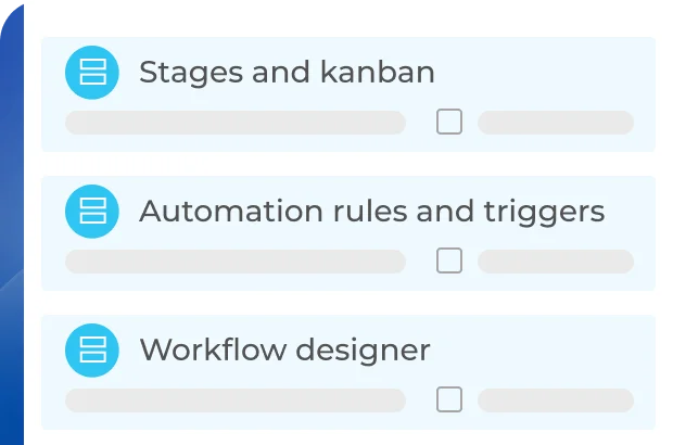 Use our templates or create a smart process from scratch. Set up custom pipelines, sales funnels, Kanban stages, default access permissions for pipelines, and more.