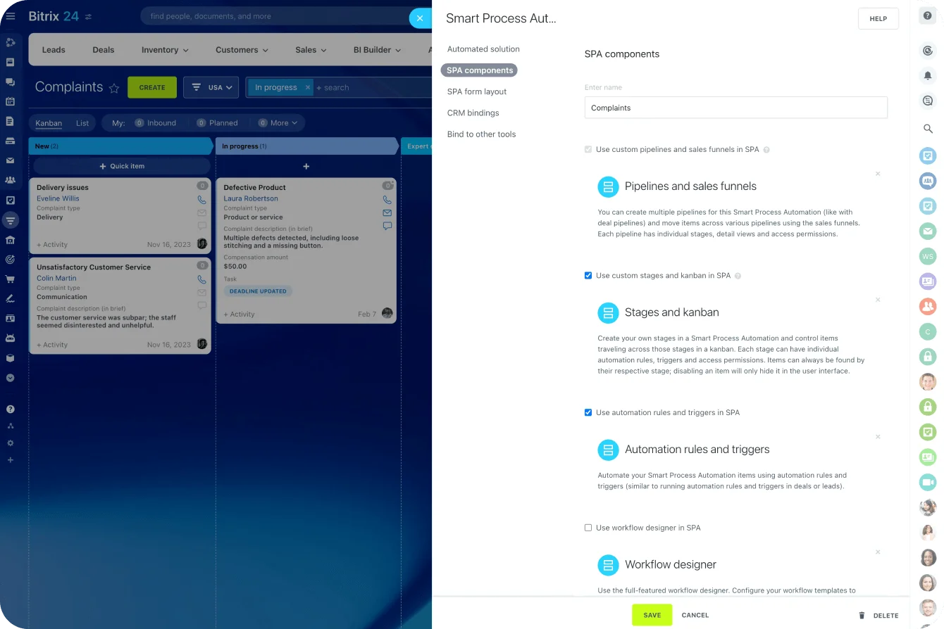 A smart process in Bitrix24 is a customizable type of element in CRM that allows you to create your own work scenarios. Go beyond deals, lead, and quotes – create and automate your own entities (contractor lists, purchase funnels, document registry, etc.).